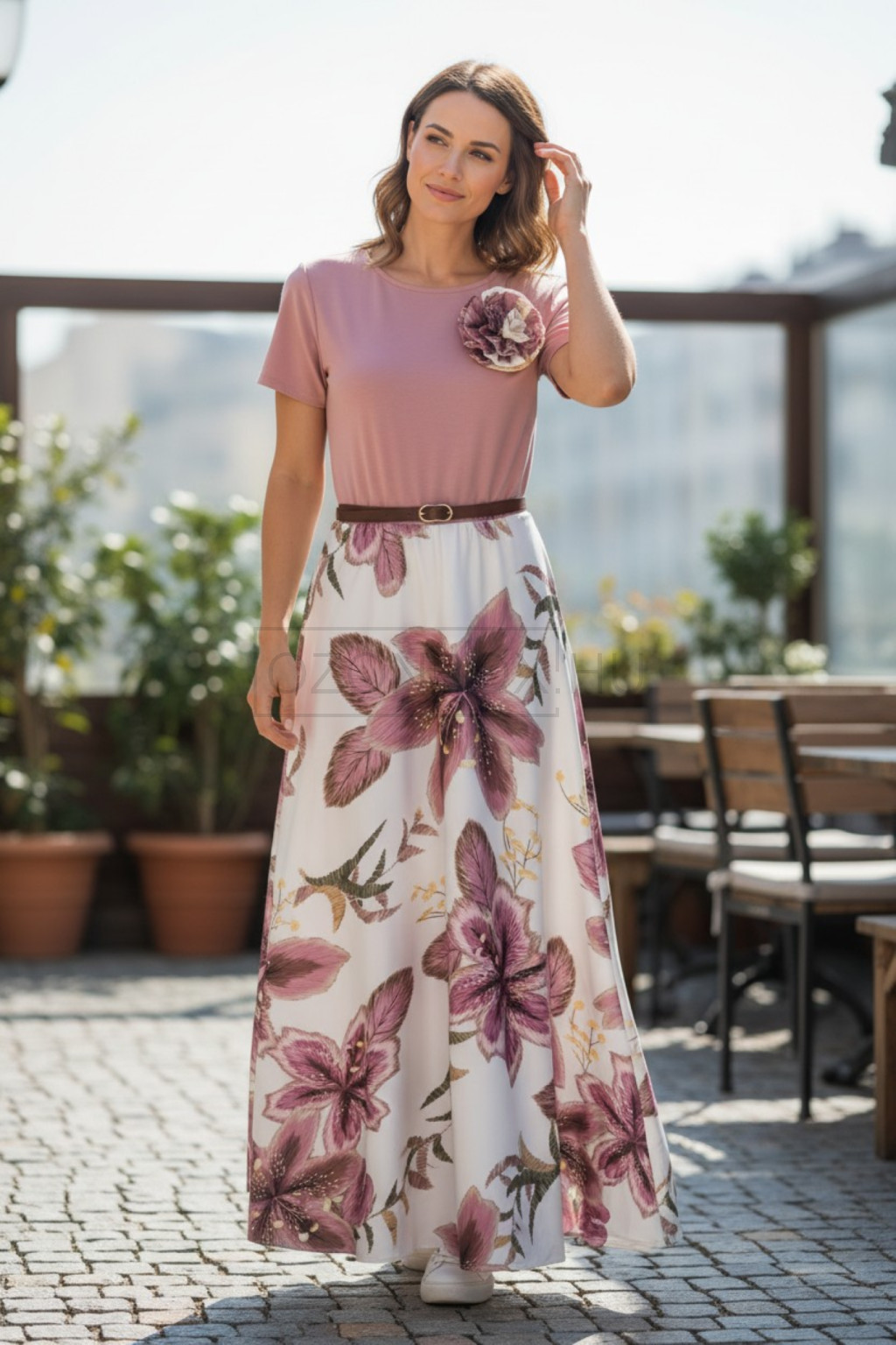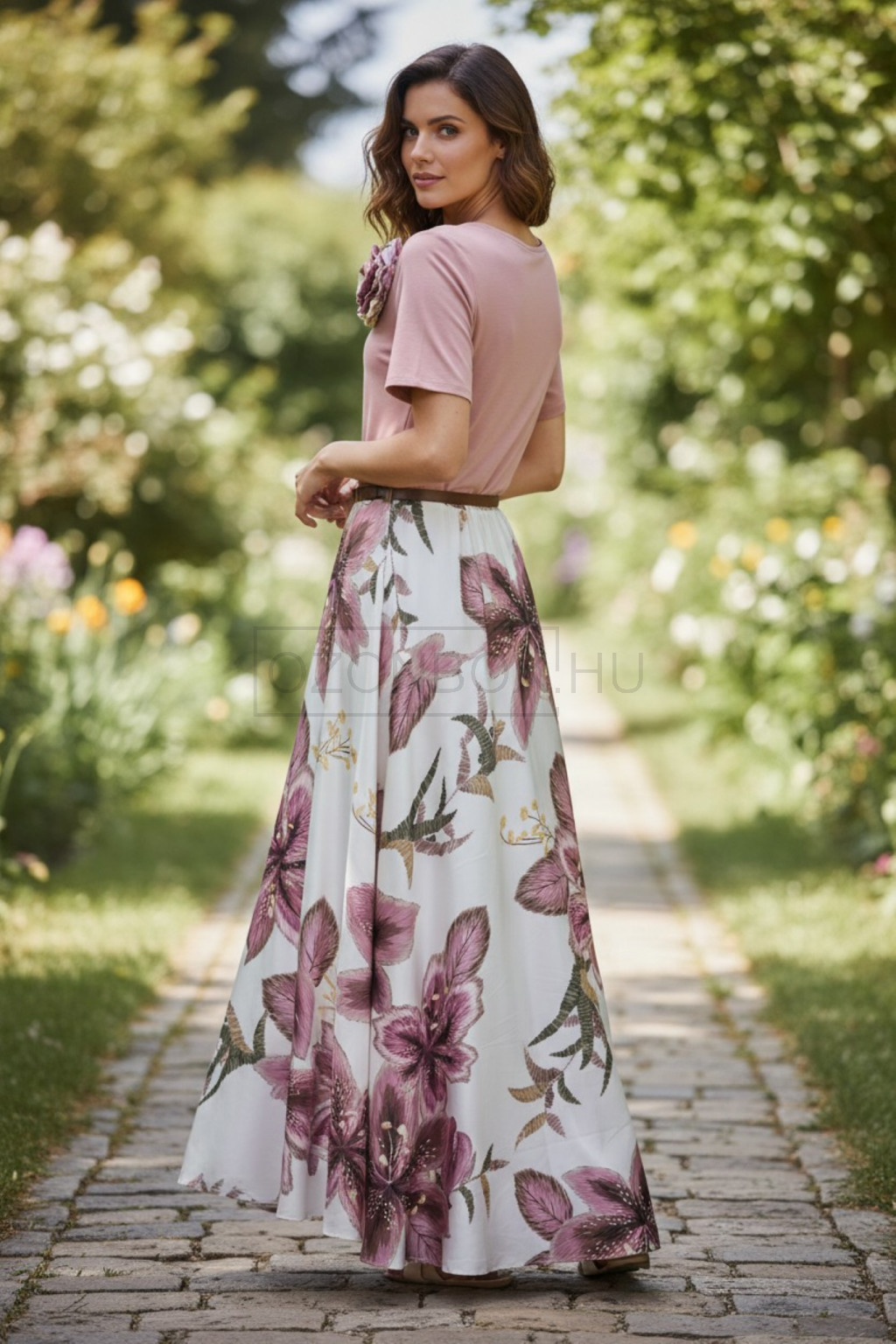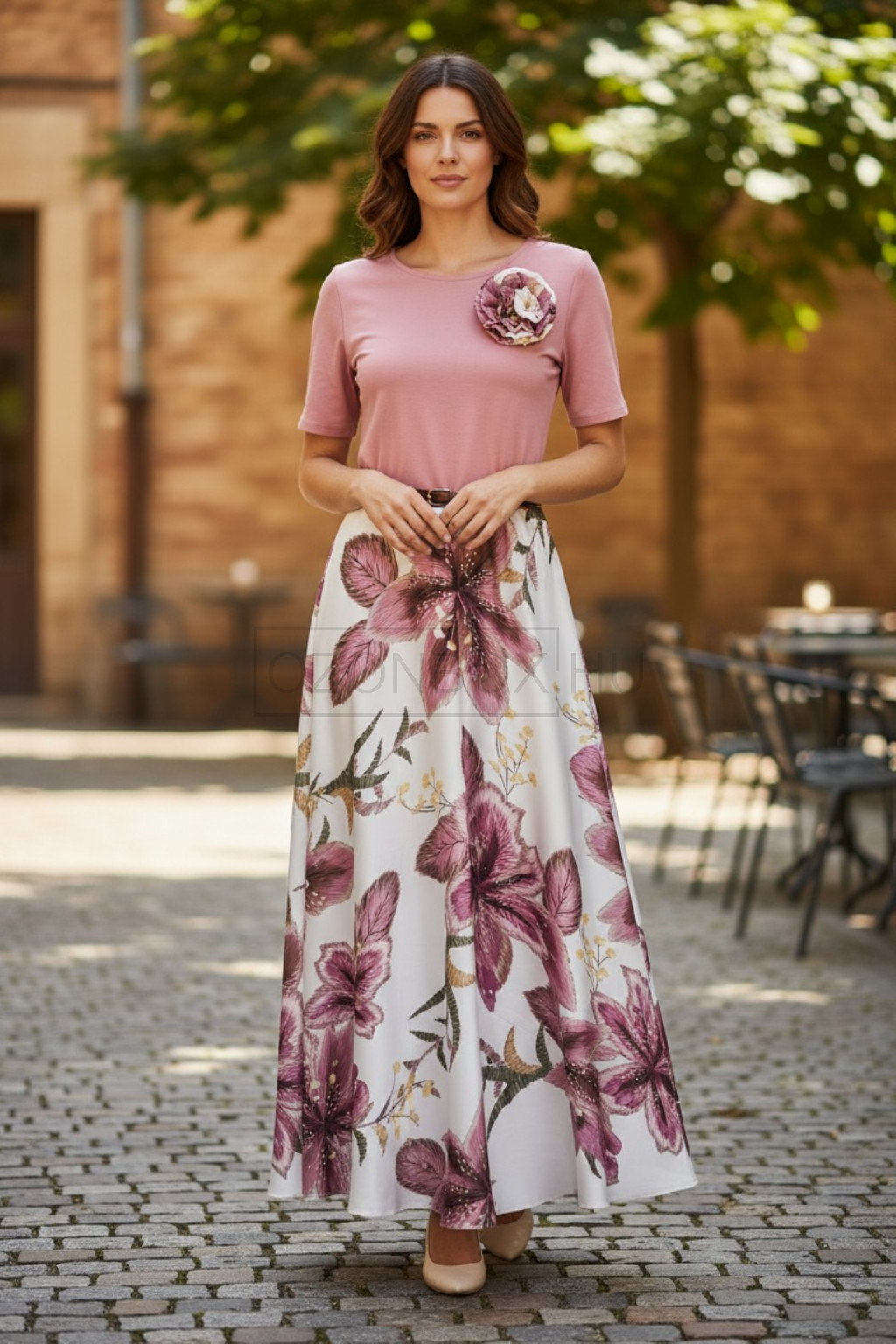 Az Elaria Light ruha a nőies elegancia és a könnyed romantika tökéletes találkozása. A lágy esésű, virágmintás szoknyarész és a finom púderrózsaszín felső harmonikus összhatást teremt, amely minden alkalmat különlegessé varázsol.