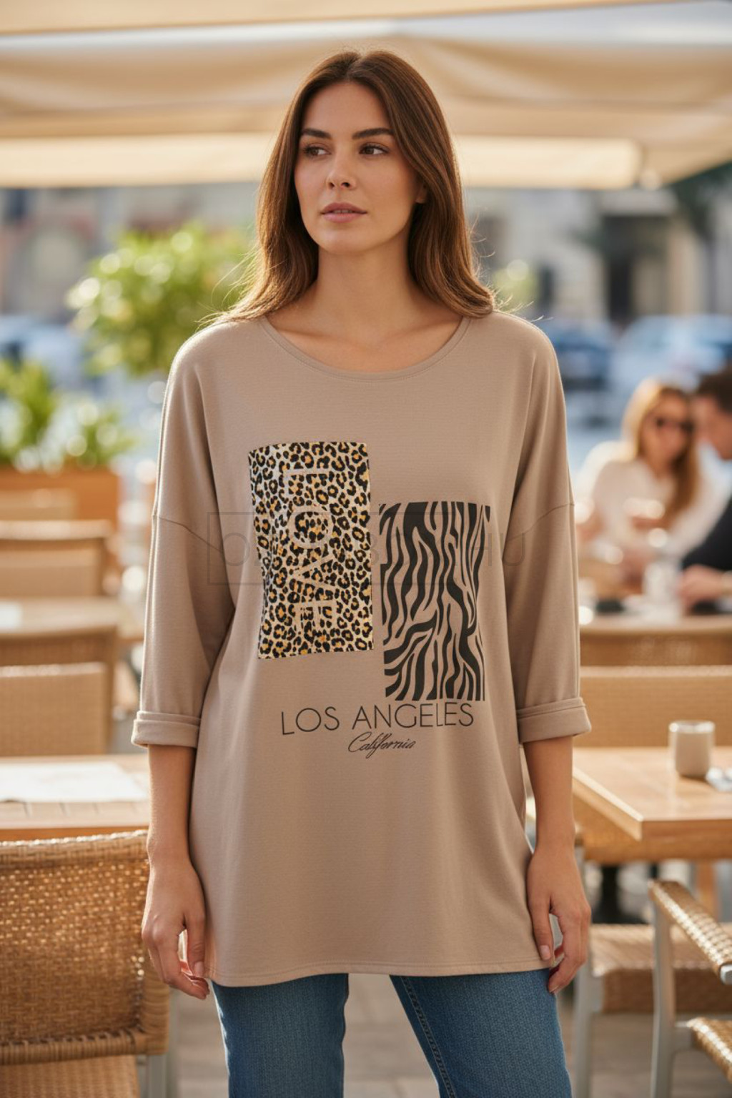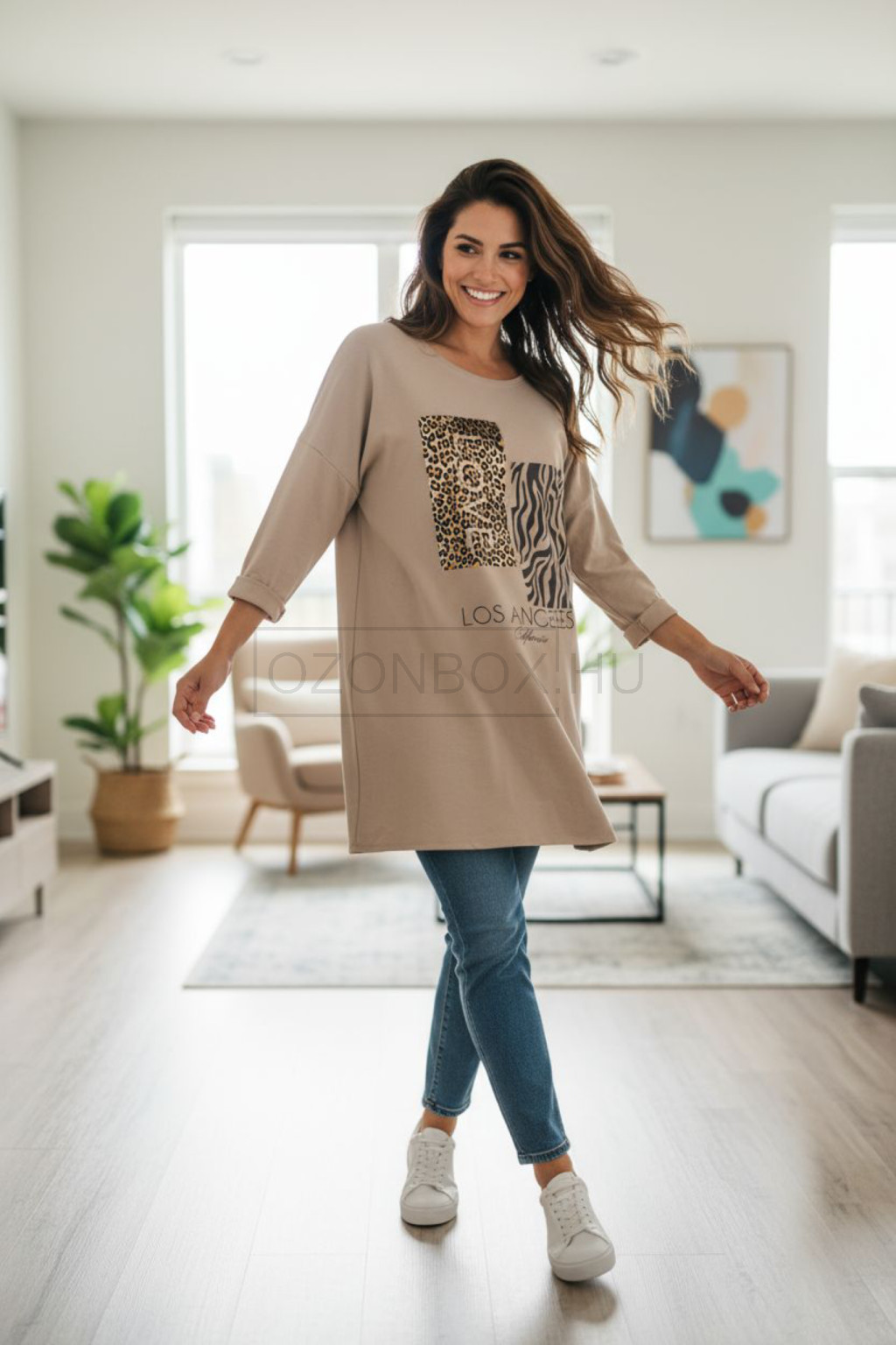 Lezser, modern és városi hangulatú darab, amely tökéletesen ötvözi a kényelmet és a stílust. Az állatmintás betétek vagány kontrasztot alkotnak a puha bézs alappal, a „Los Angeles California” felirat pedig egy kis amerikai életérzést csempész a megjelenésbe.