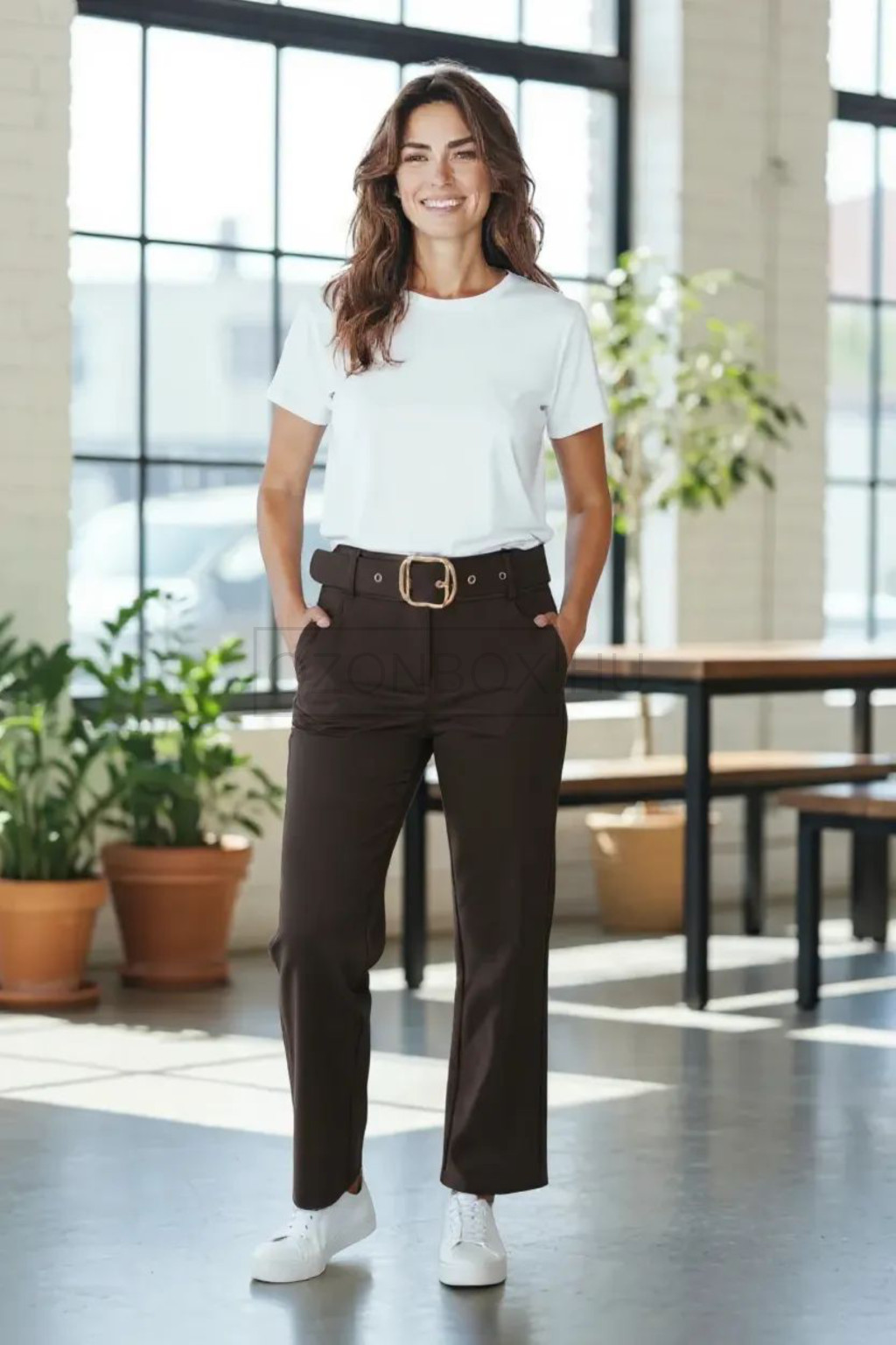 A Viviana nadrág modern letisztultságával és nőies eleganciájával könnyedén a gardróbod alapdarabjává válik. A mély barna árnyalat különlegességet sugároz, miközben a magas derék és a széles övcsat optikailag karcsúsítja az alakot. Egyenes, kényelmes szabása tökéletes választás mindennapi viselethez, ugyanakkor elég elegáns ahhoz is, hogy munkahelyre vagy esti programokra viseld.
