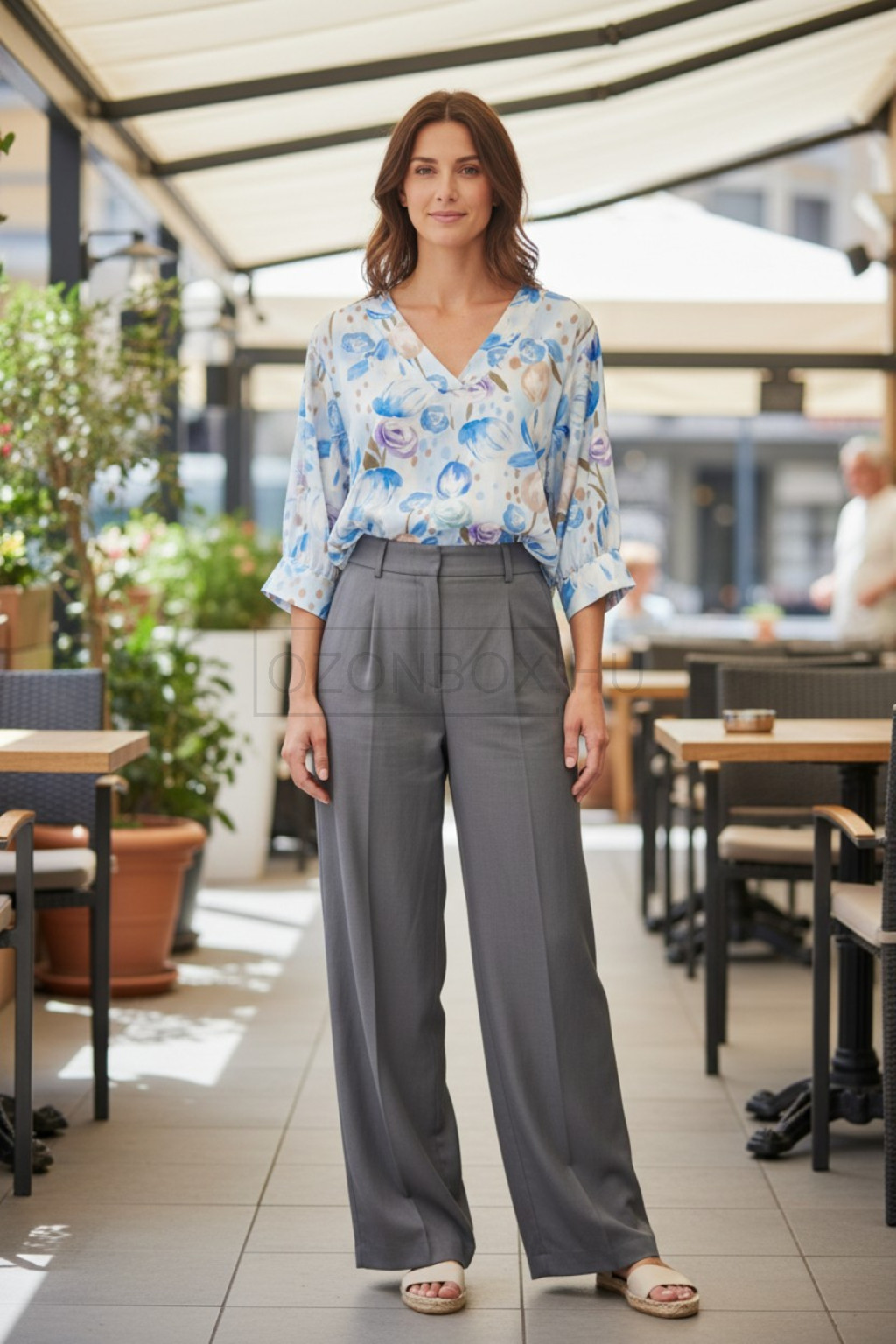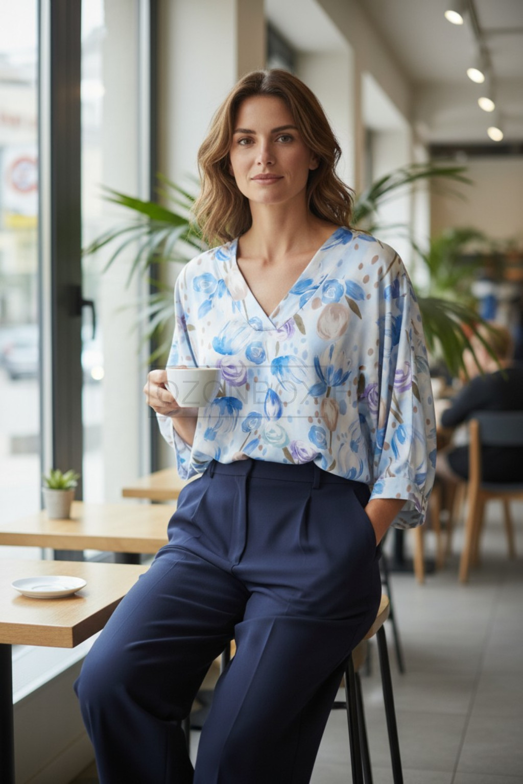 A romantikus virágmintás design és a V-kivágás finoman kiemeli a dekoltázst, így egyszerre kifinomult és modern megjelenést ad. Ideális választás irodába, városi sétákhoz vagy akár egy elegánsabb alkalomra is.