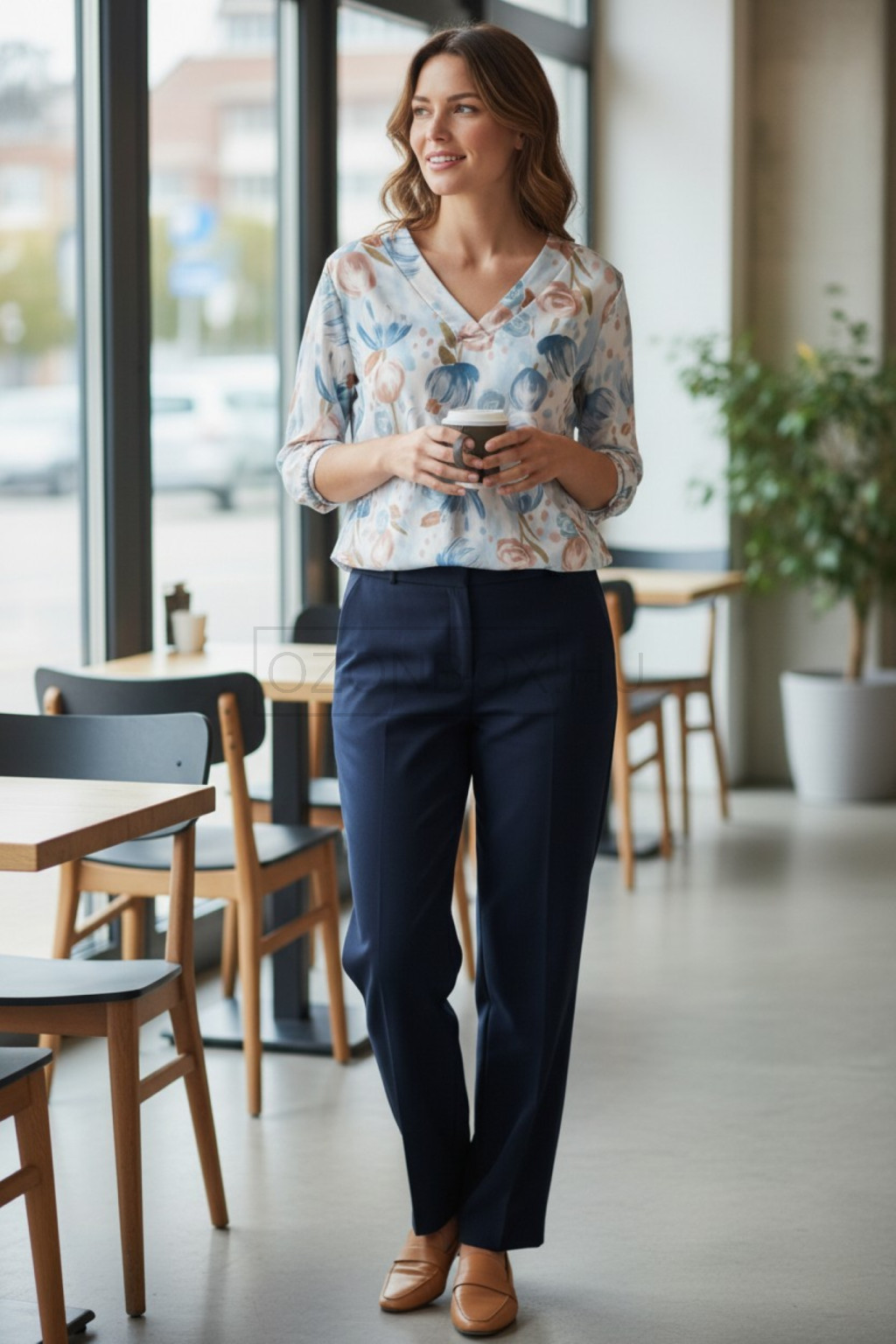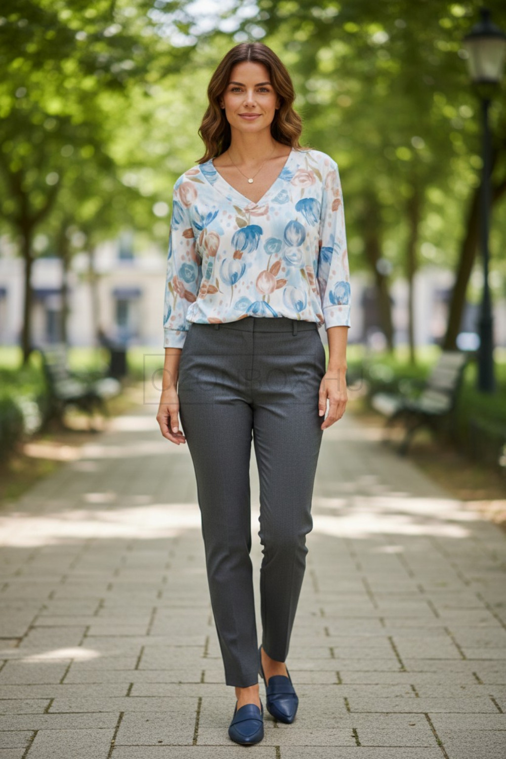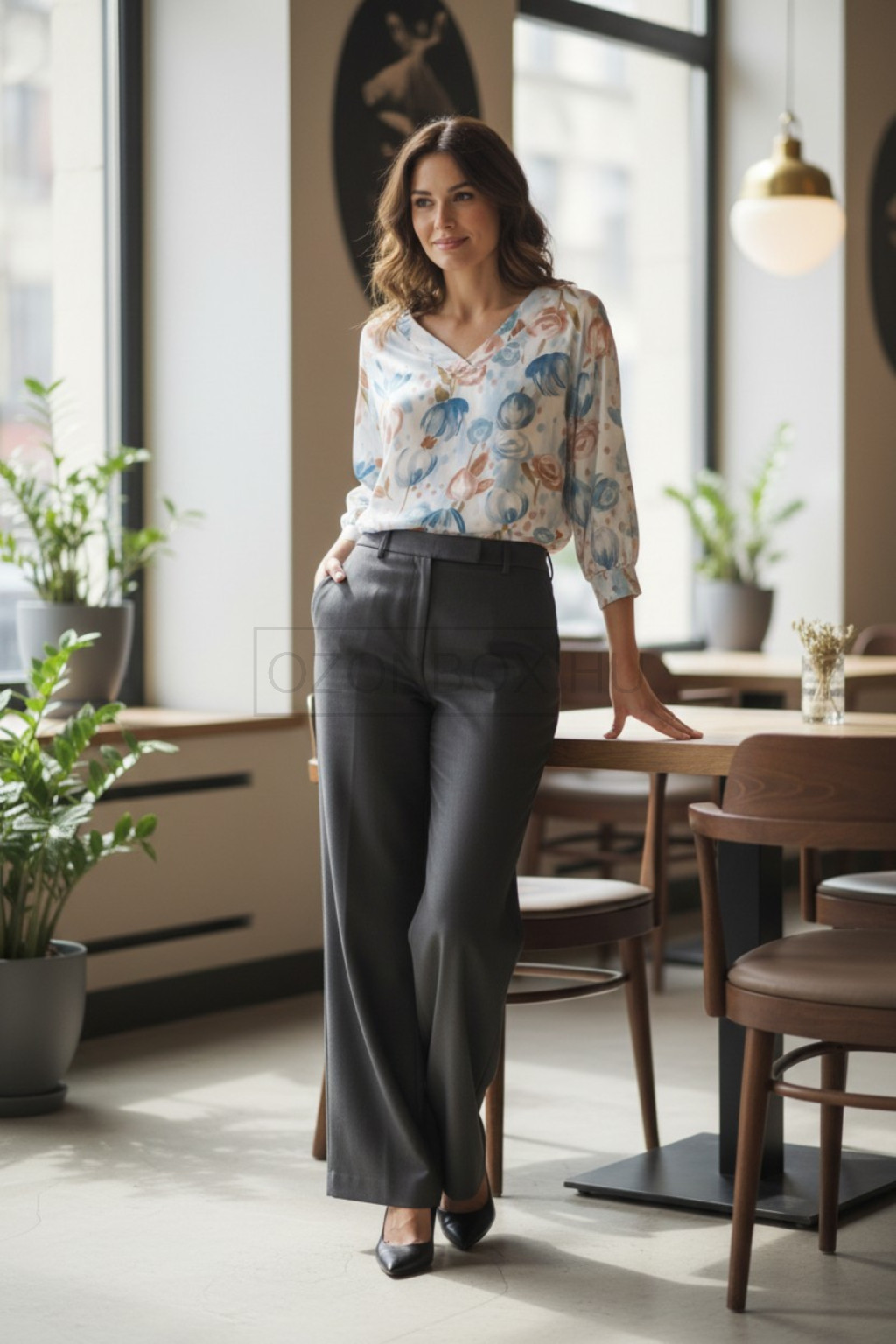 A romantikus virágmintás design és a V-kivágás finoman kiemeli a dekoltázst, így egyszerre kifinomult és modern megjelenést ad. Ideális választás irodába, városi sétákhoz vagy akár egy elegánsabb alkalomra is.