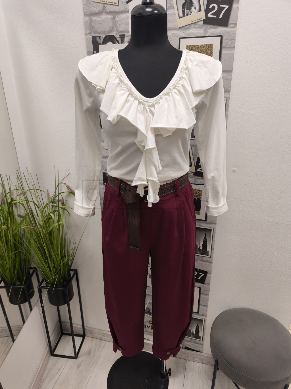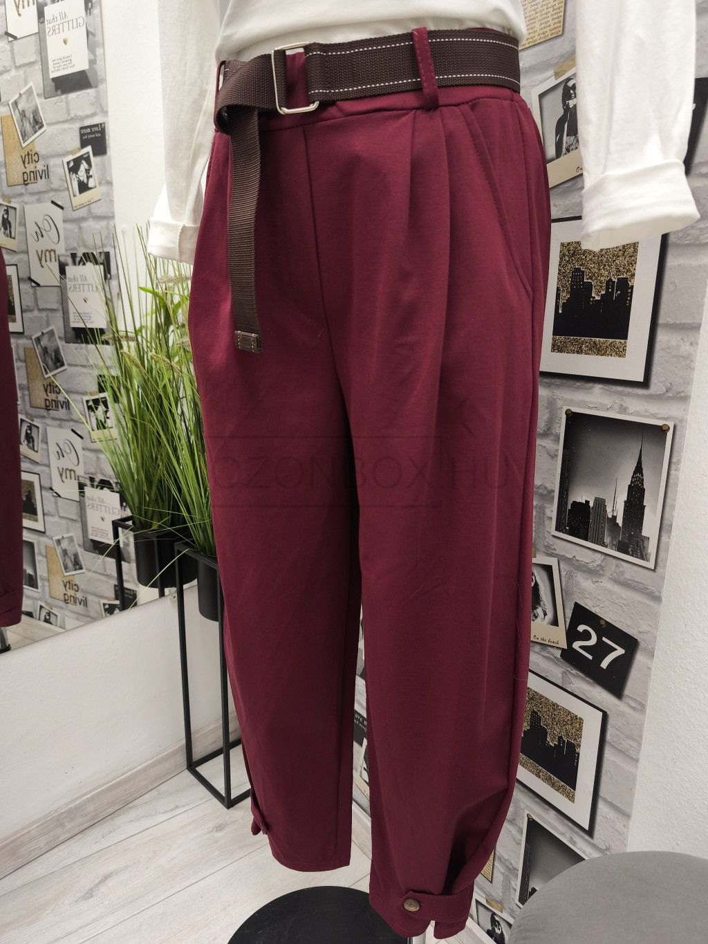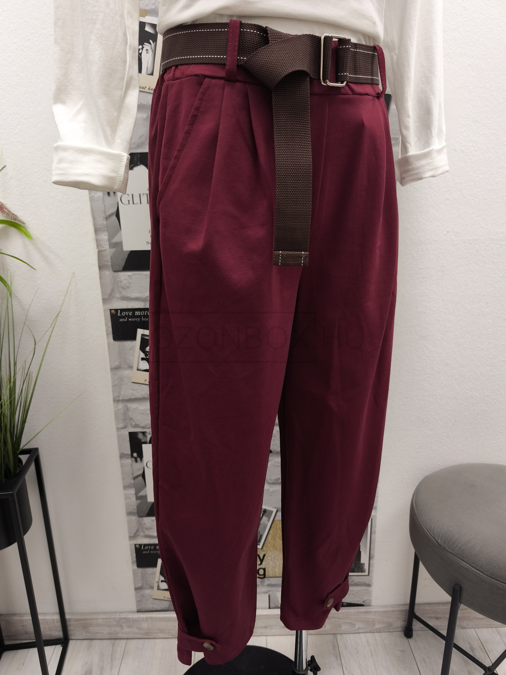 A Lucinda nadrág a kényelmet és a stílust ötvözi egy igazán különleges darabban. Klasszikus bordó árnyalata karaktert és nőiességet sugároz, míg a bő szárú, hajtásokkal díszített fazon könnyed, modern vonalat ad. A barna vászonöv nemcsak praktikus, hanem sportosan elegáns kontrasztot teremt. Az alsó rész gombos pánttal állítható, így lazább és szűkebb sziluettet is kialakíthatsz.