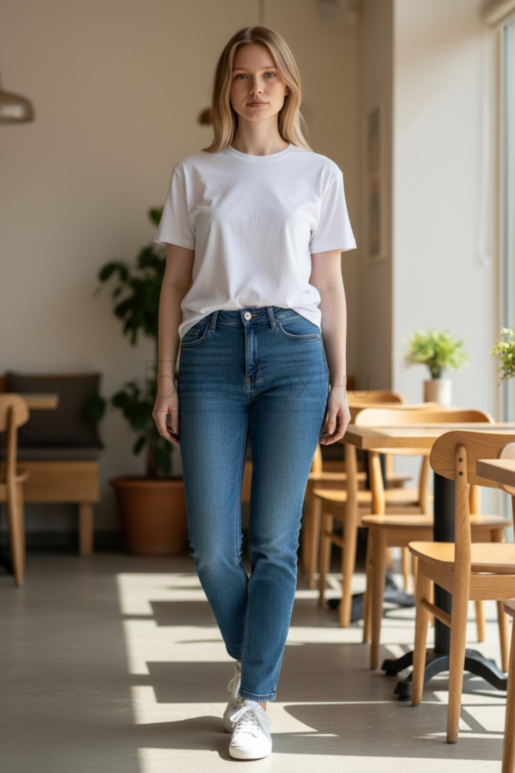Fehér pólóval és sportcipővel letisztult, minimalista megjelenést ad. Blézerrel és bokacsizmával máris elegánsabb, városi outfitet kapsz.