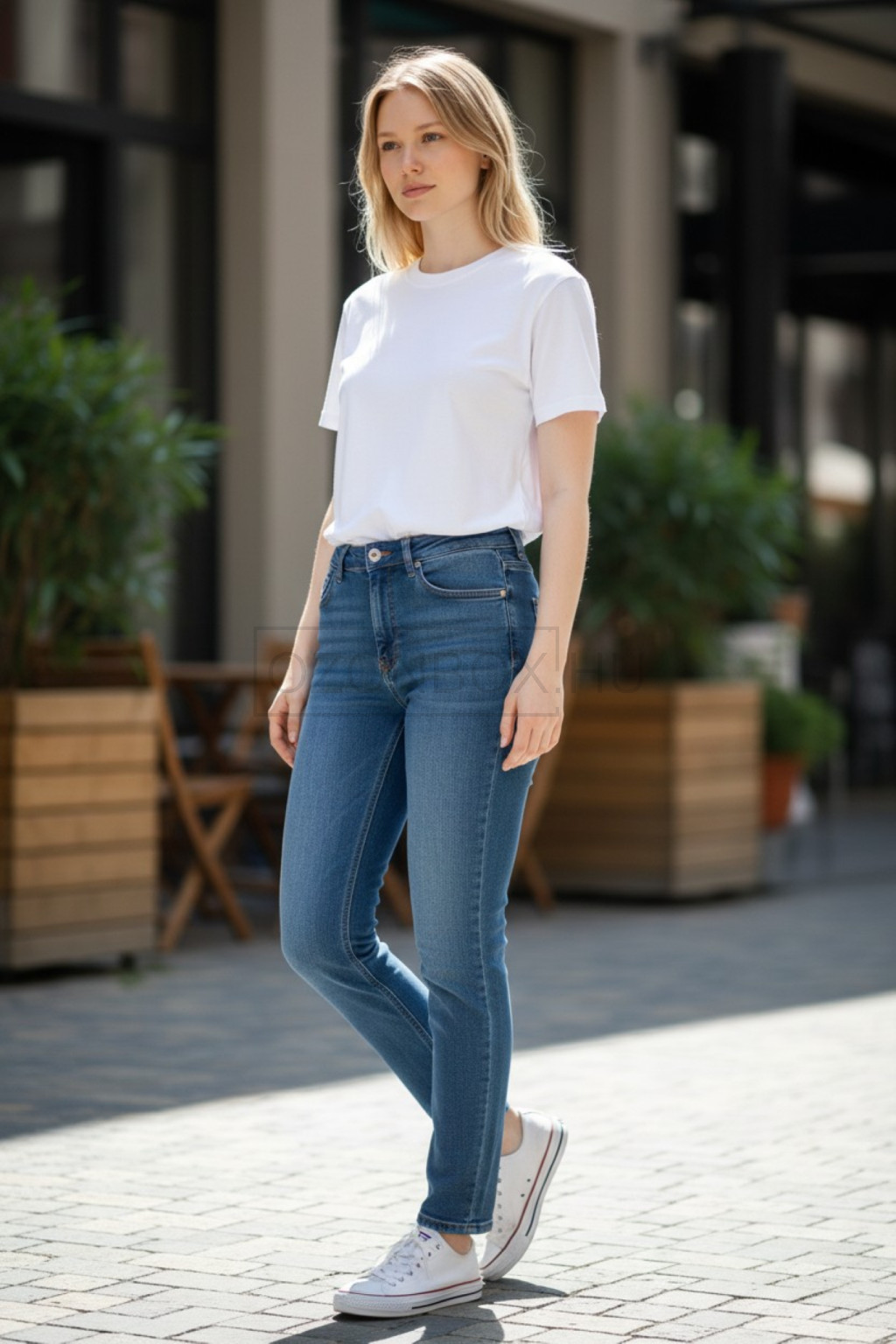Közepes derékmagassága stabil tartást ad, optikailag nyújtja a lábakat, a letisztult, enyhén mosott kék árnyalat pedig időtálló alapdarabbá teszi a gardróbban.