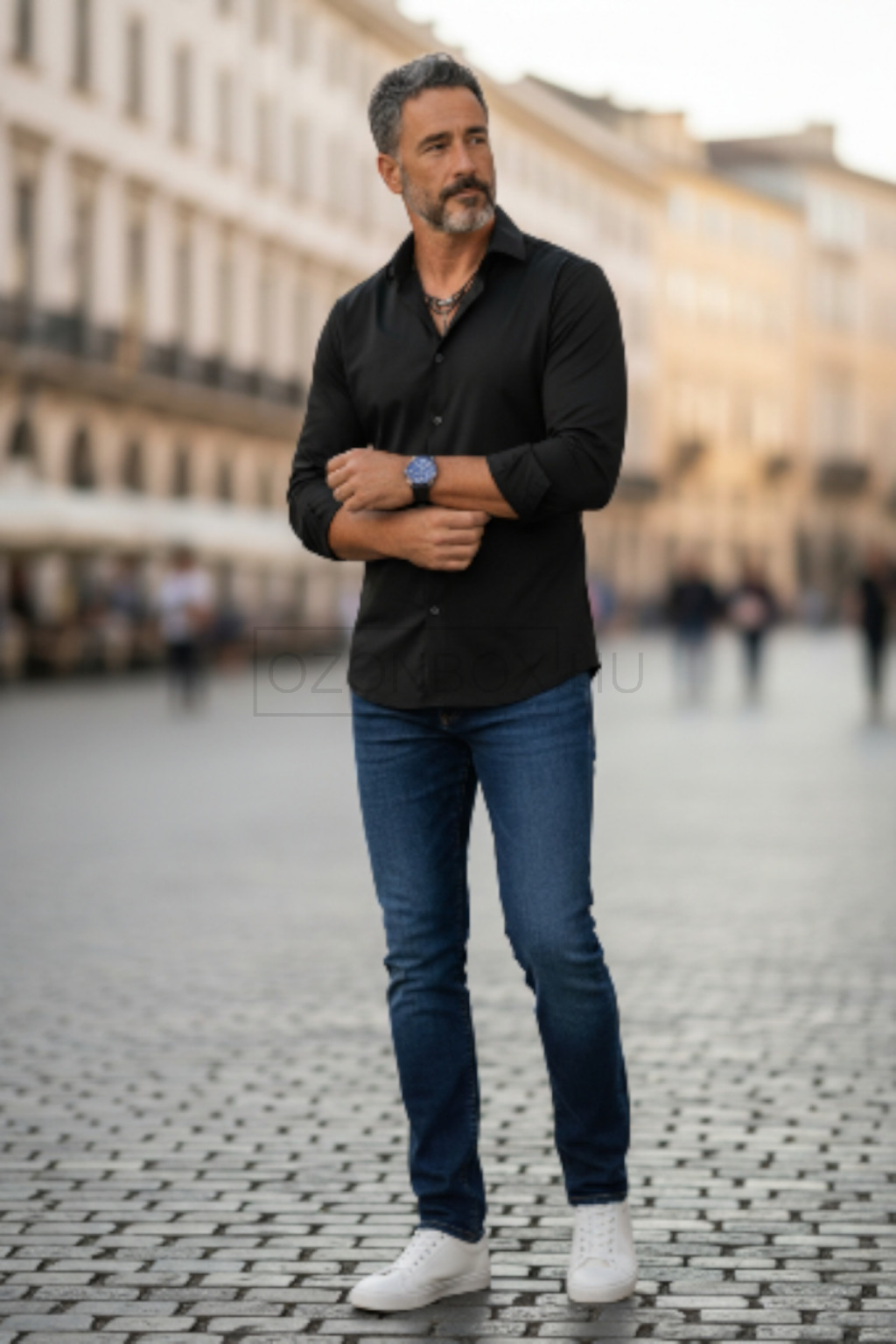 A klasszikus fekete ing modern, letisztult újragondolása.