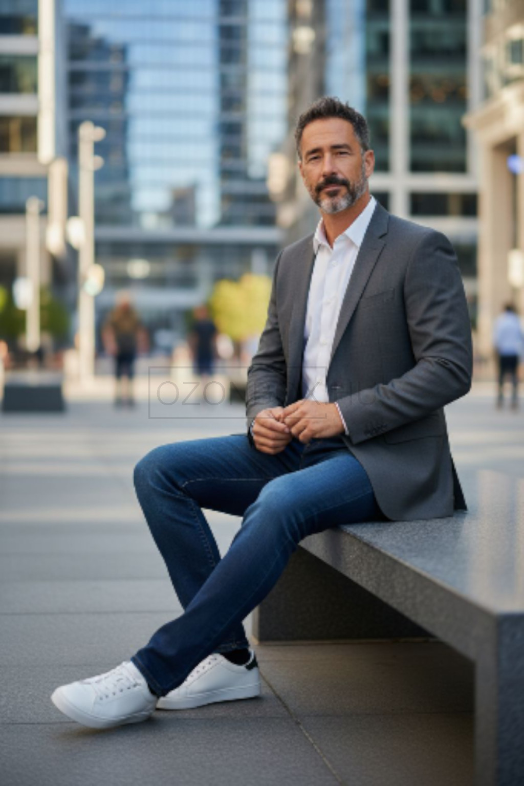Viseld fehér inggel és barna bőrcipővel, ha magabiztos, professzionális összhatást szeretnél – a városi elegancia garantált.