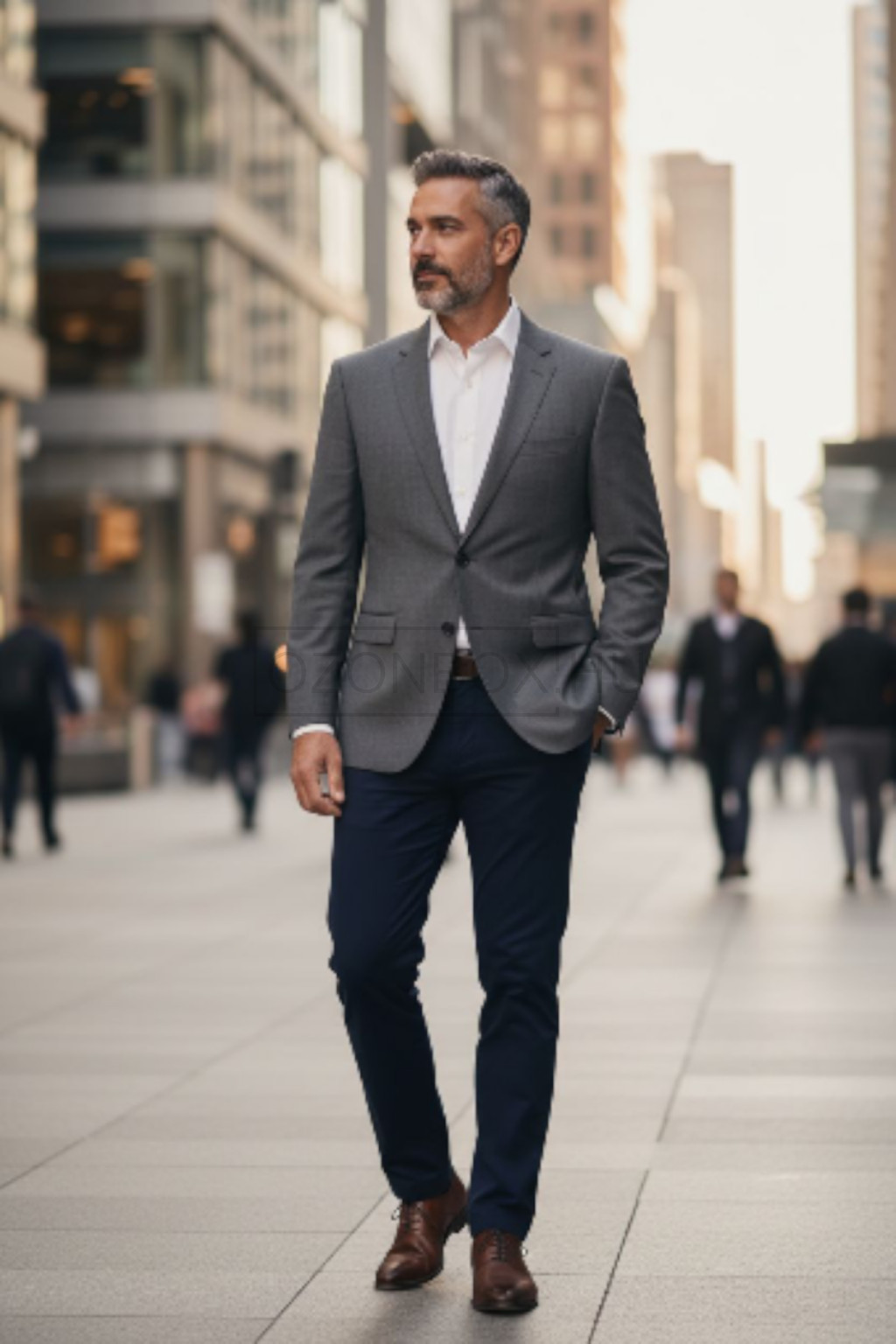 A középszürke árnyalat sokoldalú és stílusos – könnyedén kombinálható fehér inggel, elegáns chinoszal vagy akár sötét farmerrel is, így ideális választás irodába, üzleti találkozóra vagy smart casual eseményekre.